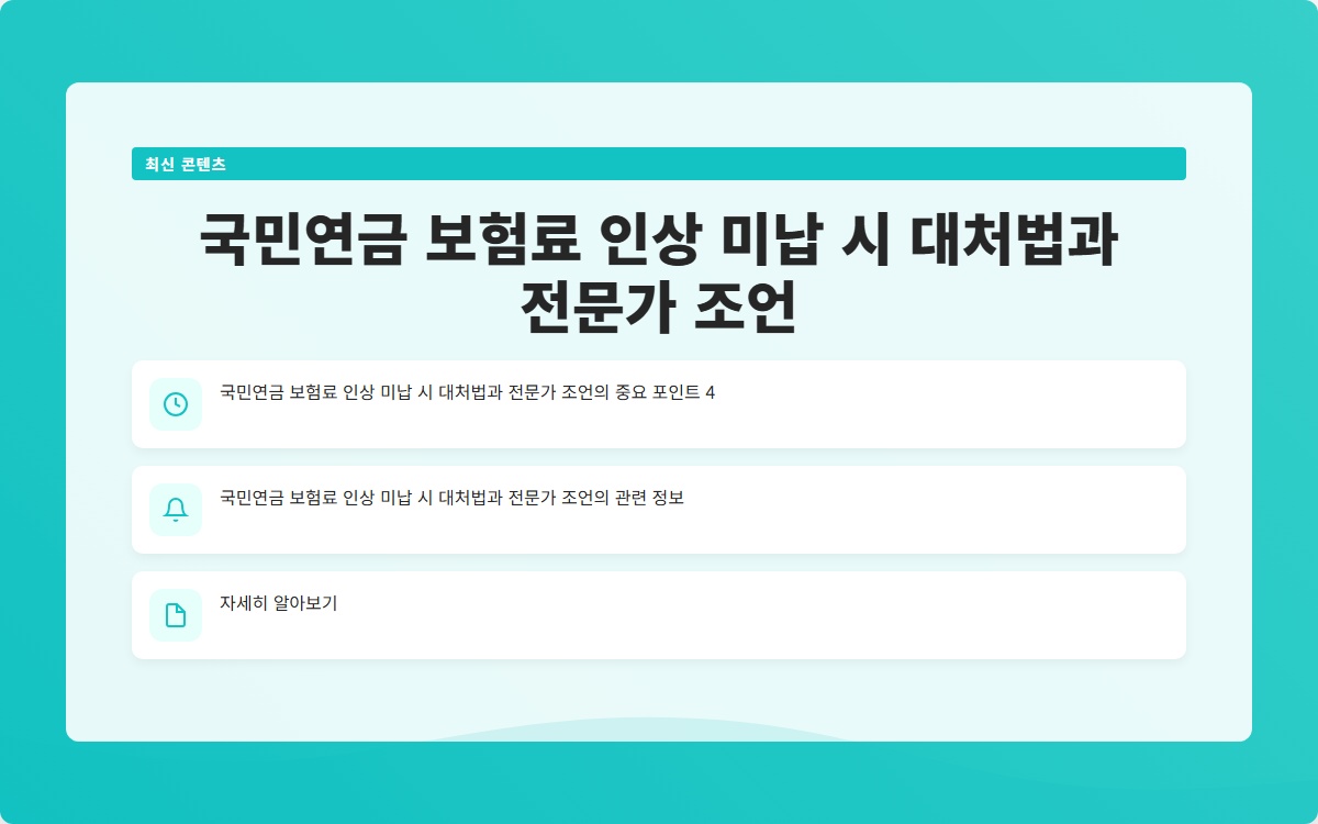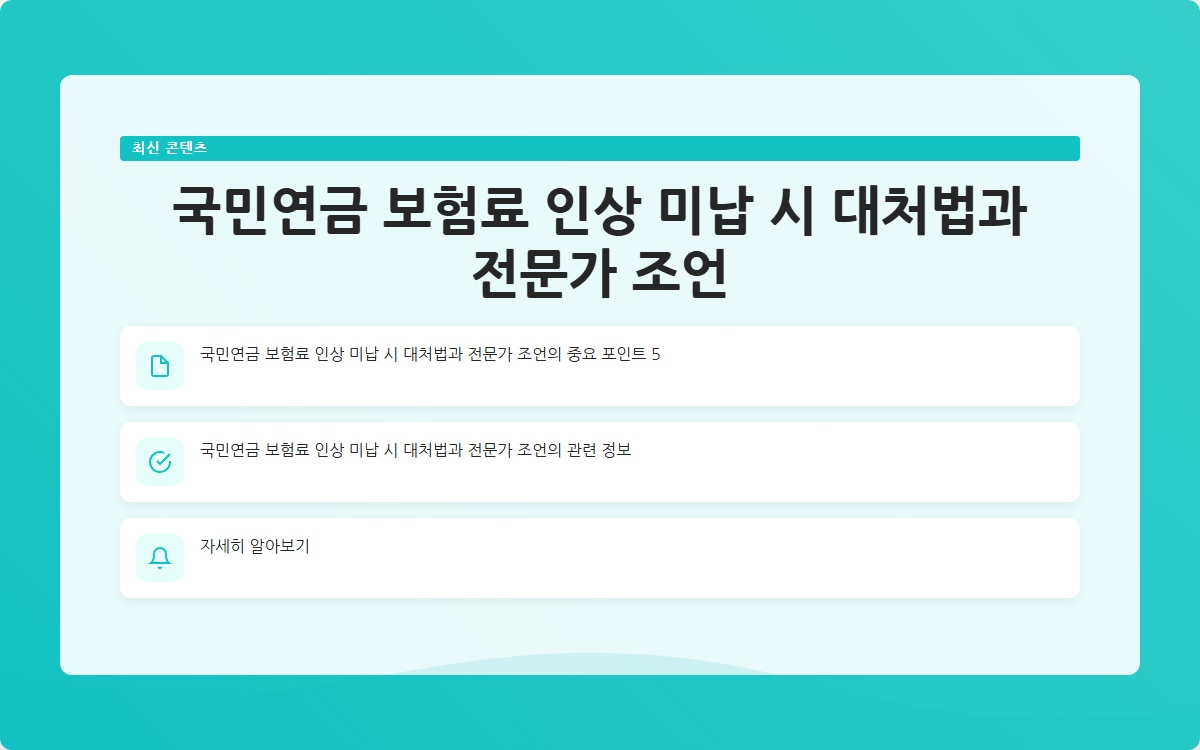 국민연금, 보험료 인상, 미납 대처법, 국민연금 건강보험료, 보험료 조회, 재정 관리, 저소득층, 자영업자, 보험료 계산, 정부 정책Q. 국민연금 보험료 인상에 따른 미납 시 어떻게 대처해야 하나요?