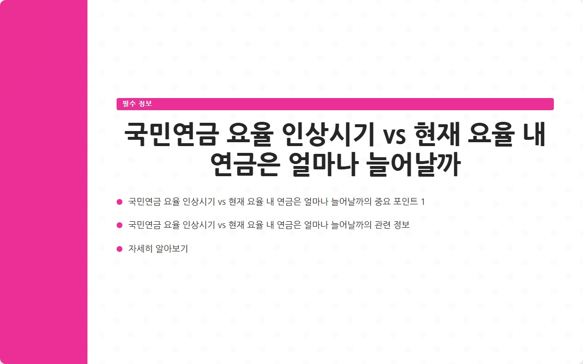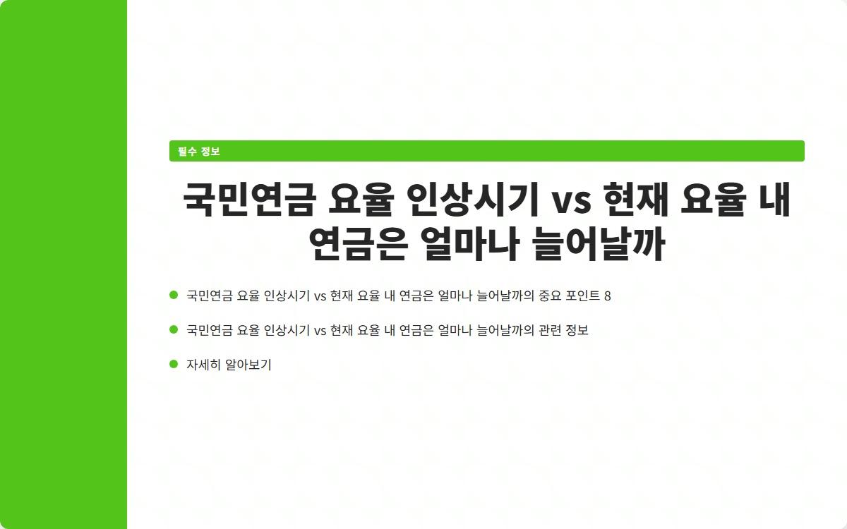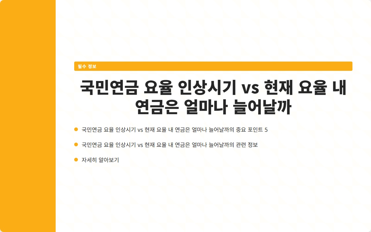국민연금 요율 인상시기는 많은 이들의 관심사입니다. 현재 많은 사람들이 국민연금에 대한 불안과 우려를 가지고 있습니다. 하지만 이번 개혁안으로 인해 미래의 연금 수령액이 어떻게 변화할지 구체적으로 알 수 있습니다. 지금 확인해보세요!