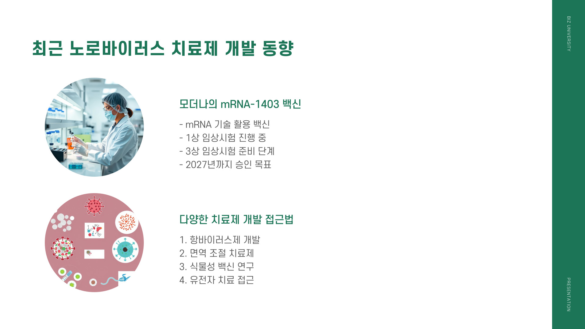 - 노로바이러스 약의 개발은 예방과 치료를 위한 중요한 전환점.