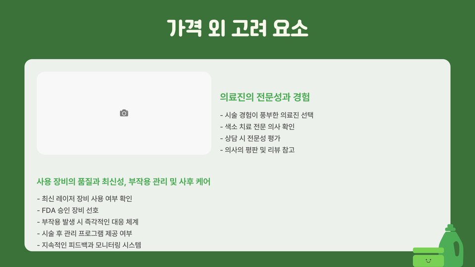 - 가격은 시술 장소, 전문의의 경력, 장비에 따라 다양합니다.