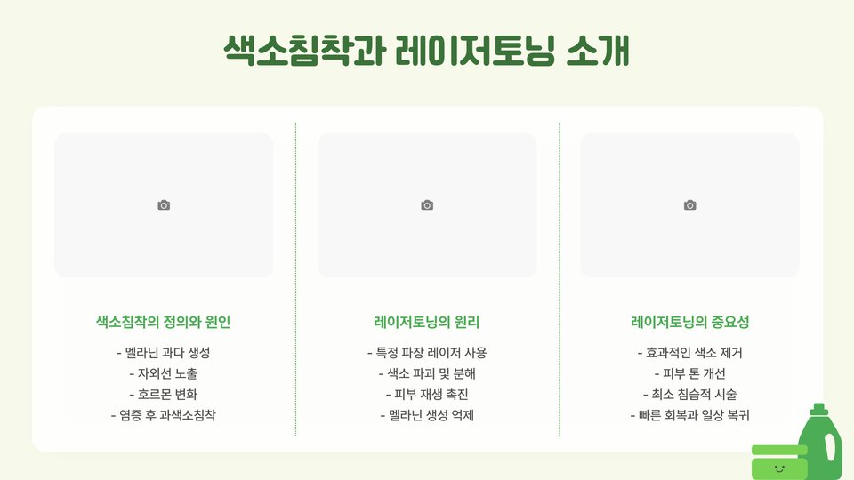 색소침착레이저토닝은 레이저를 이용하여 피부의 불균형한 색소를 조절하는 과정입니다. 이 시술은 전문가에 의해 시행되며, 피부타입과 상태에 따라 맞춤형으로 진행됩니다. 레이저는 고주파를 방출하여 피부 깊숙이 침투하며, 멜라닌 세포를 파괴하여 색소 문제를 해결합니다.