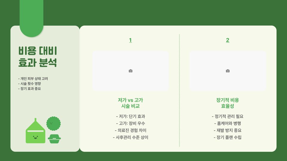 서울과 같은 대도시에서는 비용이 상대적으로 비쌀 수 있지만, 지방에서는 저렴한 가격으로 동일한 효과를 기대할 수 있습니다. 또한, 고급 클리닉일수록 가격이 비싸지만, 제공되는 서비스의 질과 장비의 최신성을 고려했을 때 선택할 가치가 있을 수 있습니다.