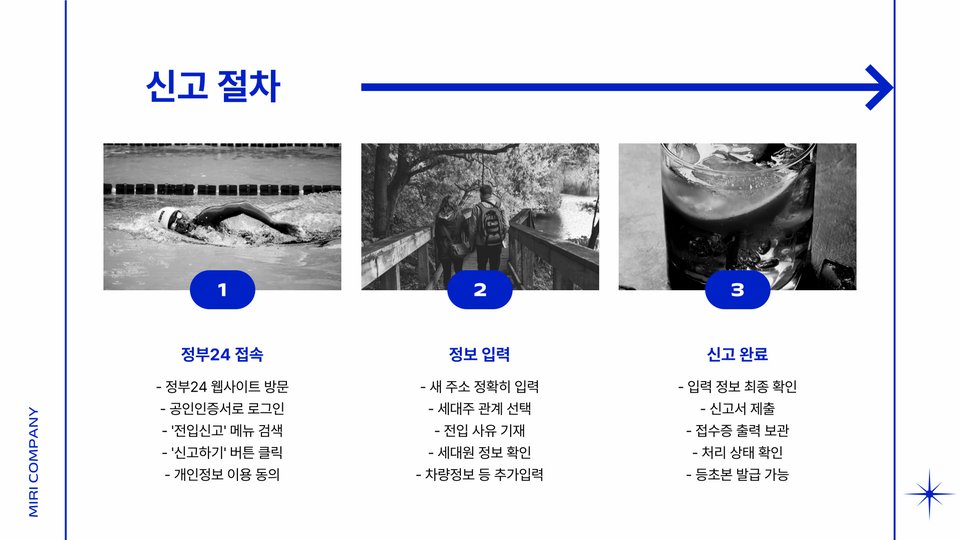 정부24를 이용한 전입 신고는 다음의 단계를 통해 진행됩니다. 첫째, 정부24 홈페이지에 접속하여 회원가입 후 로그인합니다. 로그인 후, 상단 메뉴에서 주민등록 항목을 선택합니다. 둘째, 전입 신고를 선택한 후, 필요한 정보를 입력합니다. 이 과정에서는 새로운 주소와 이전 주소, 가족 구성원에 대한 정보를 입력해야 합니다. 마지막으로, 입력한 정보를 확인하고 제출하면 전입 신고가 완료됩니다.