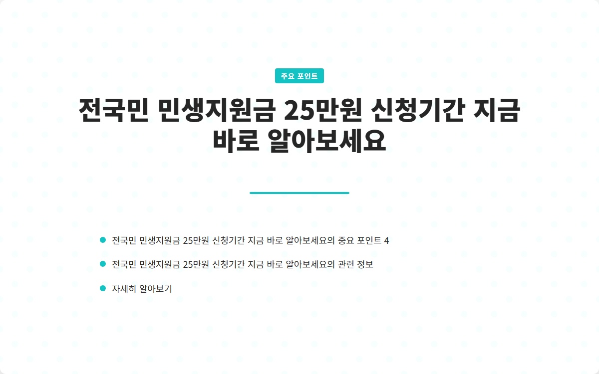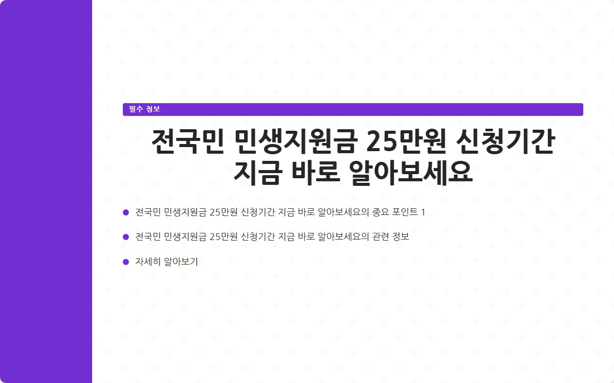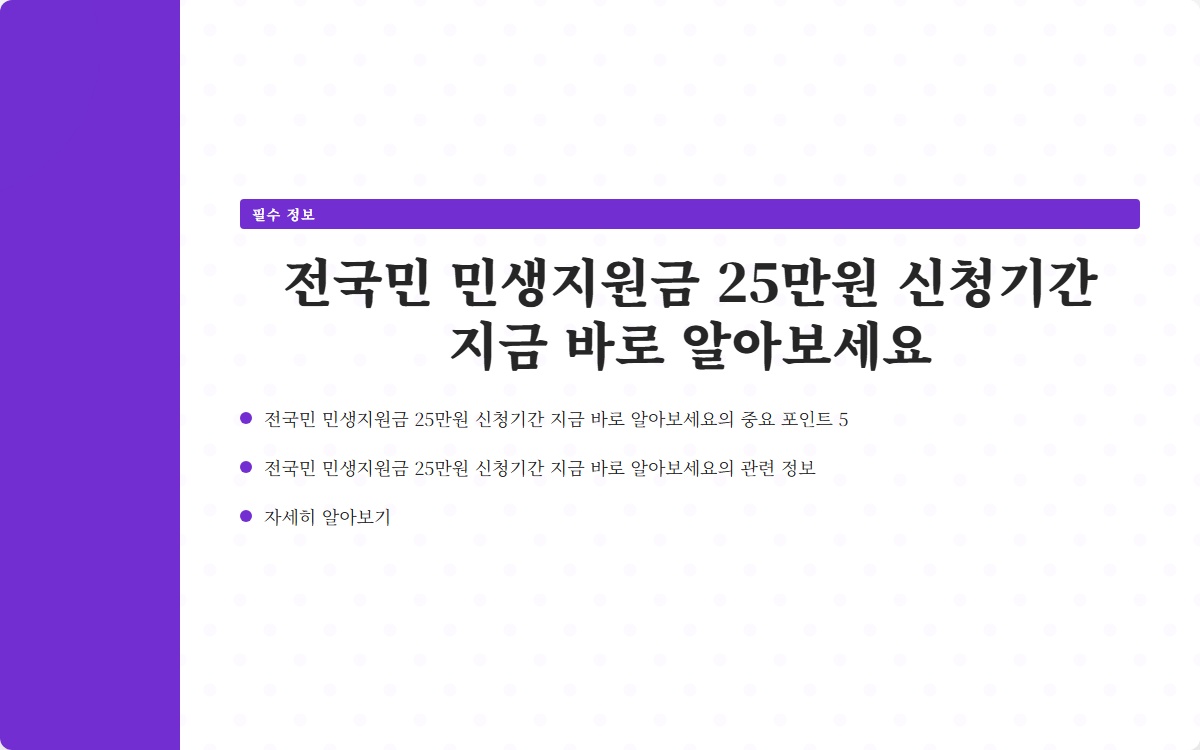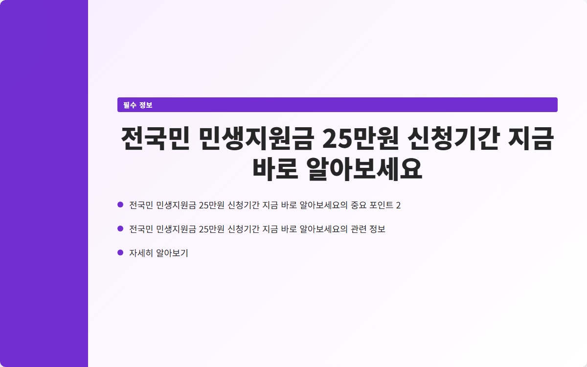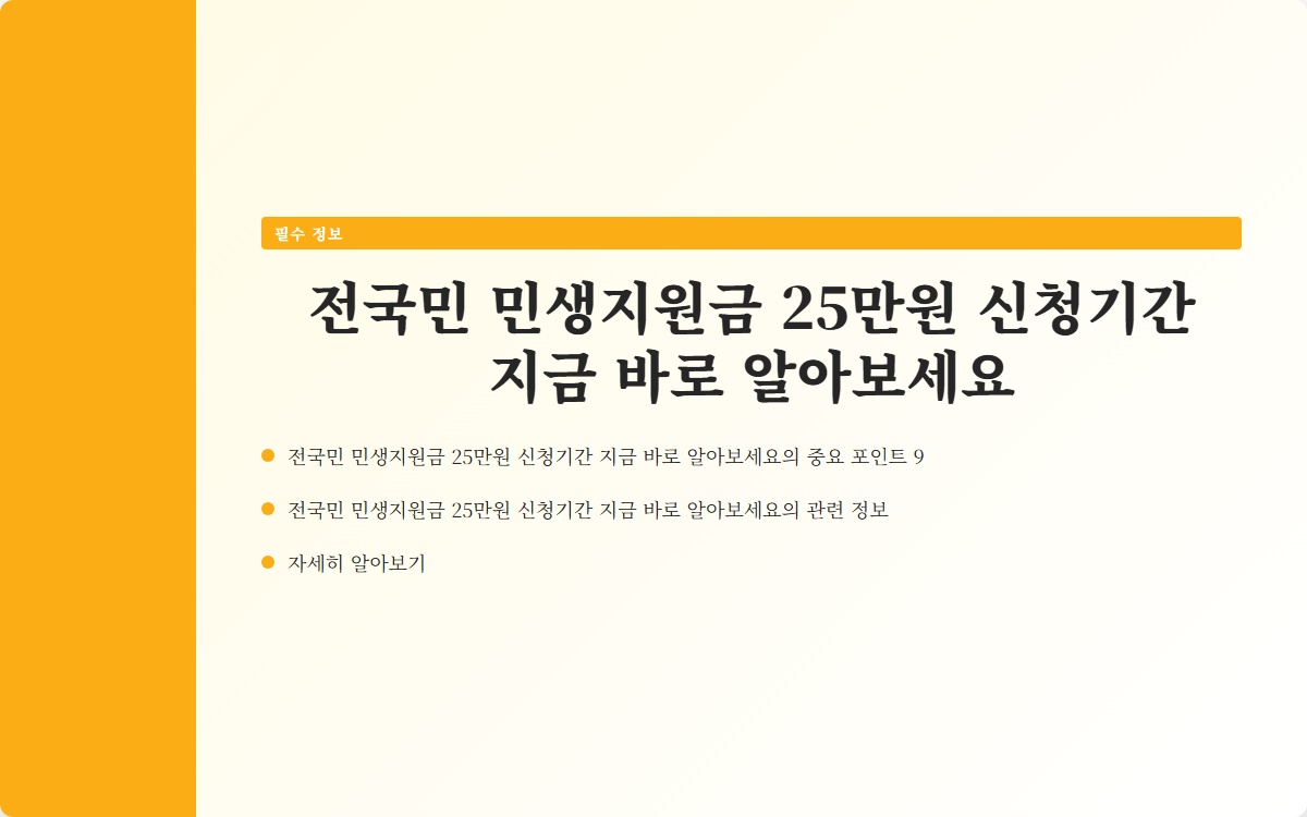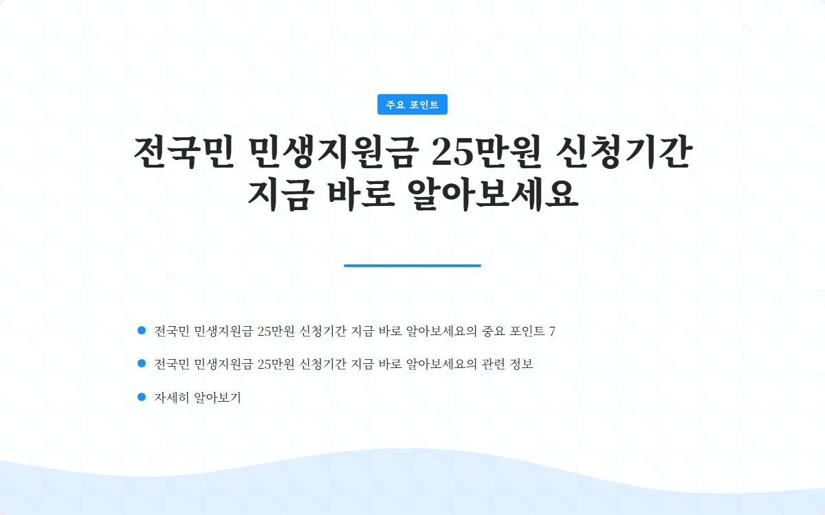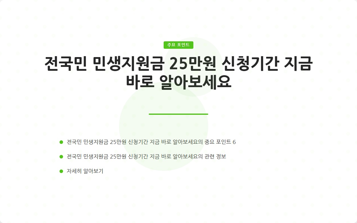 이 글을 통해 전국민 민생지원금 25만원 신청기간과 신청 방법에 대해 상세히 알아보겠습니다. 이를 통해 여러분은 지원금을 받고, 생활 안정을 도모할 수 있게 될 것입니다.