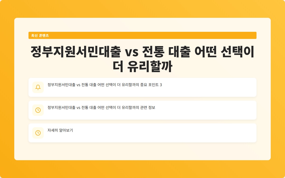 대출을 고민하는 많은 분들이 어려운 경제 상황 속에서 선택을 해야 합니다. 이 글을 통해 정부 지원 서민 대출과 전통 대출의 차이점을 명확히 이해하고, 상황에 맞는 최적의 선택을 할 수 있도록 돕겠습니다.