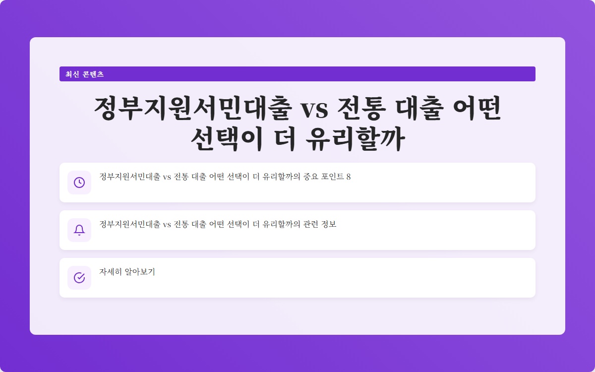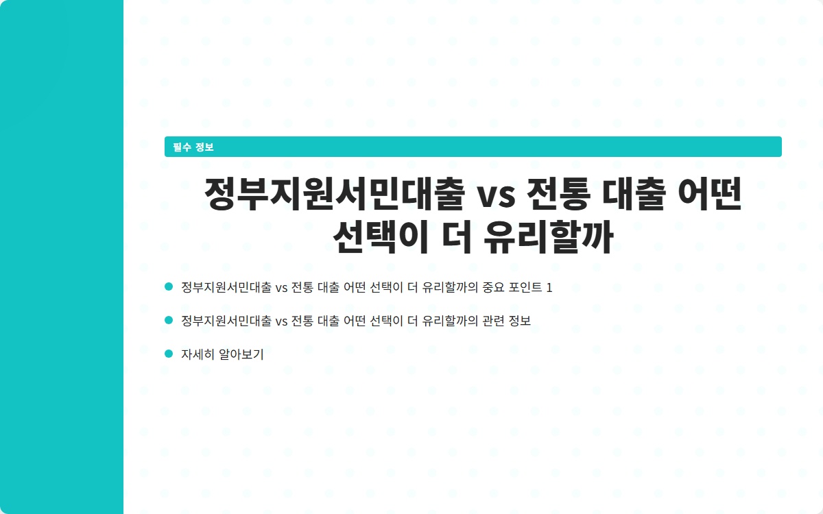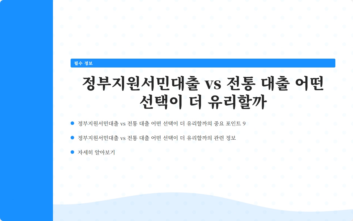 대출을 고민하는 많은 분들이 어려운 경제 상황 속에서 선택을 해야 합니다. 이 글을 통해 정부 지원 서민 대출과 전통 대출의 차이점을 명확히 이해하고, 상황에 맞는 최적의 선택을 할 수 있도록 돕겠습니다.