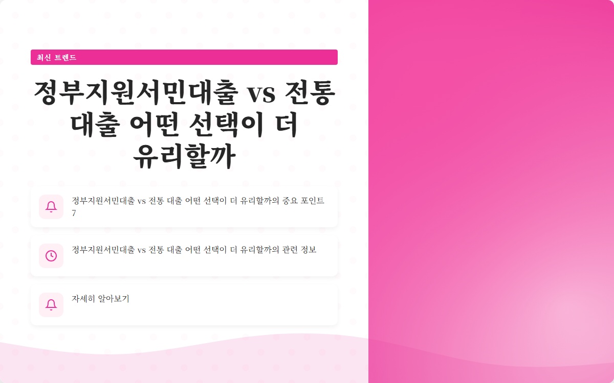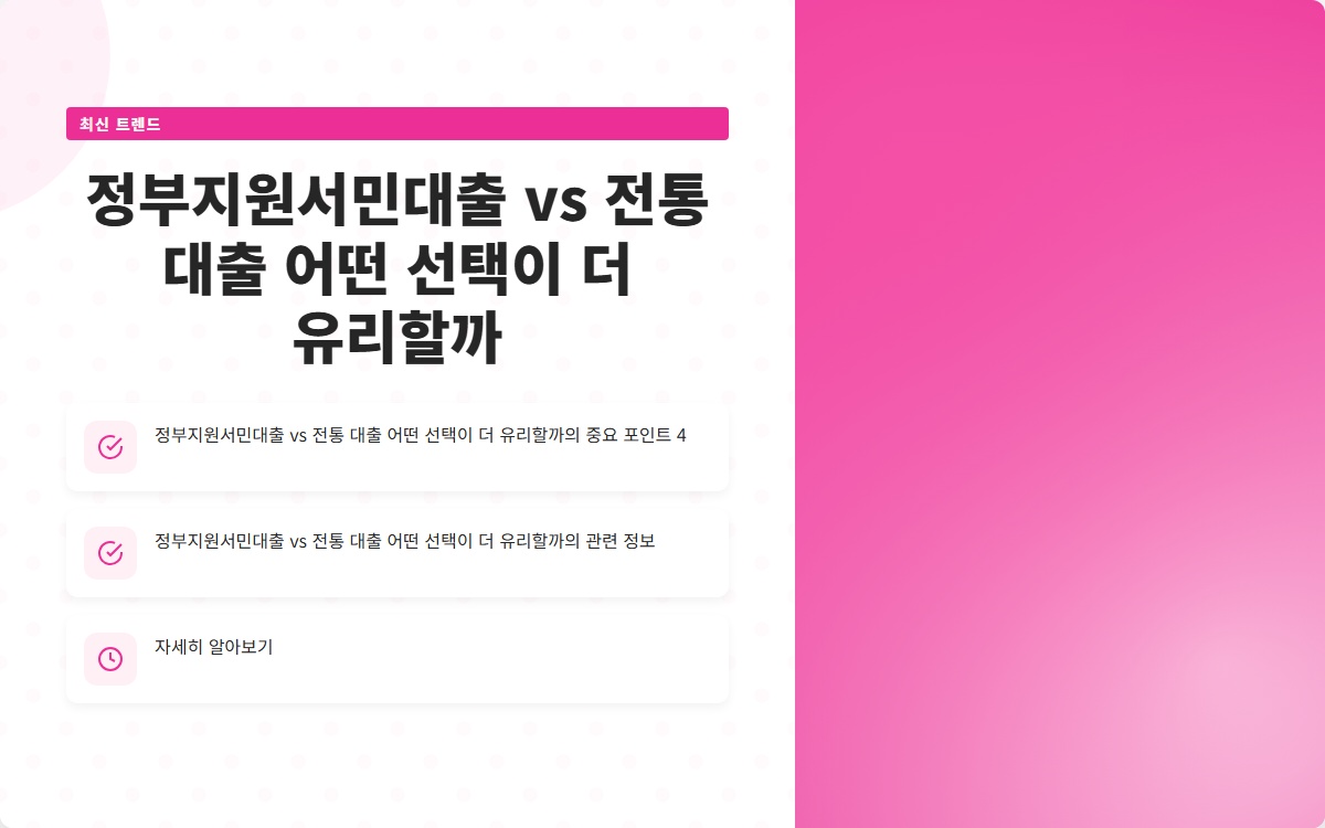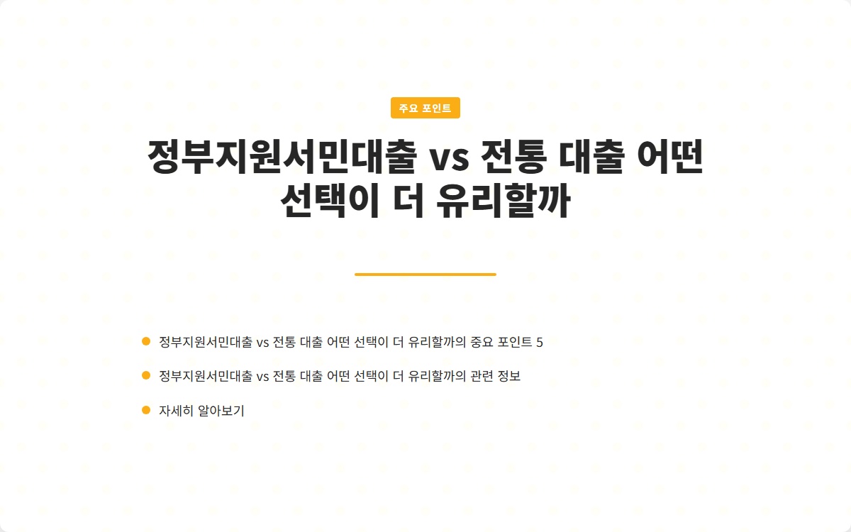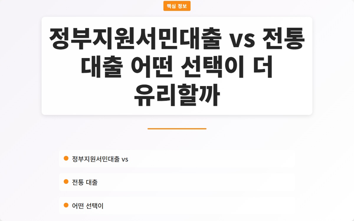 대출을 고민하는 많은 분들이 어려운 경제 상황 속에서 선택을 해야 합니다. 이 글을 통해 정부 지원 서민 대출과 전통 대출의 차이점을 명확히 이해하고, 상황에 맞는 최적의 선택을 할 수 있도록 돕겠습니다.